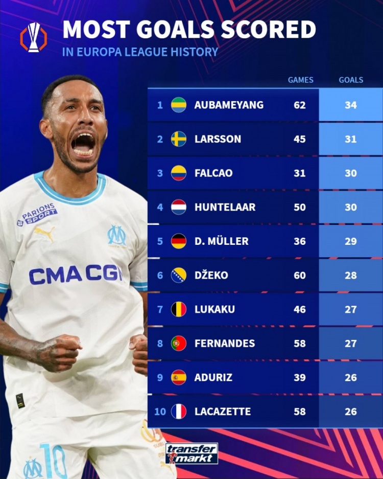 9月25日讯 德国转会市场盘点了欧联杯球员历史得分 排名,奥巴梅扬34球居首。
