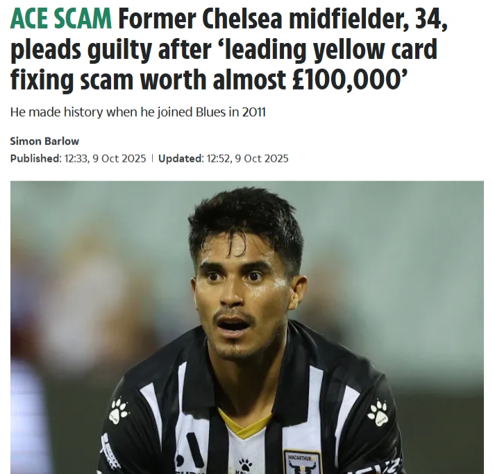 10月09日讯 据英媒《太阳报》报道,前切尔西球员乌利塞斯-达维拉承认在澳超加入 假球,在法庭上对犯罪事实供认不讳。