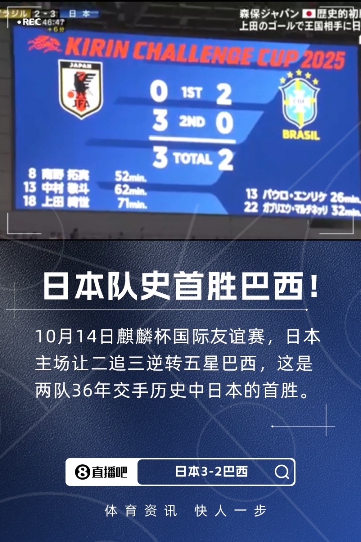 10月14日讯 国际友情 赛麒麟应战 杯,日本队主场作战 让二追三3-2击败巴西队。这是日本队队史首次击败巴西队。