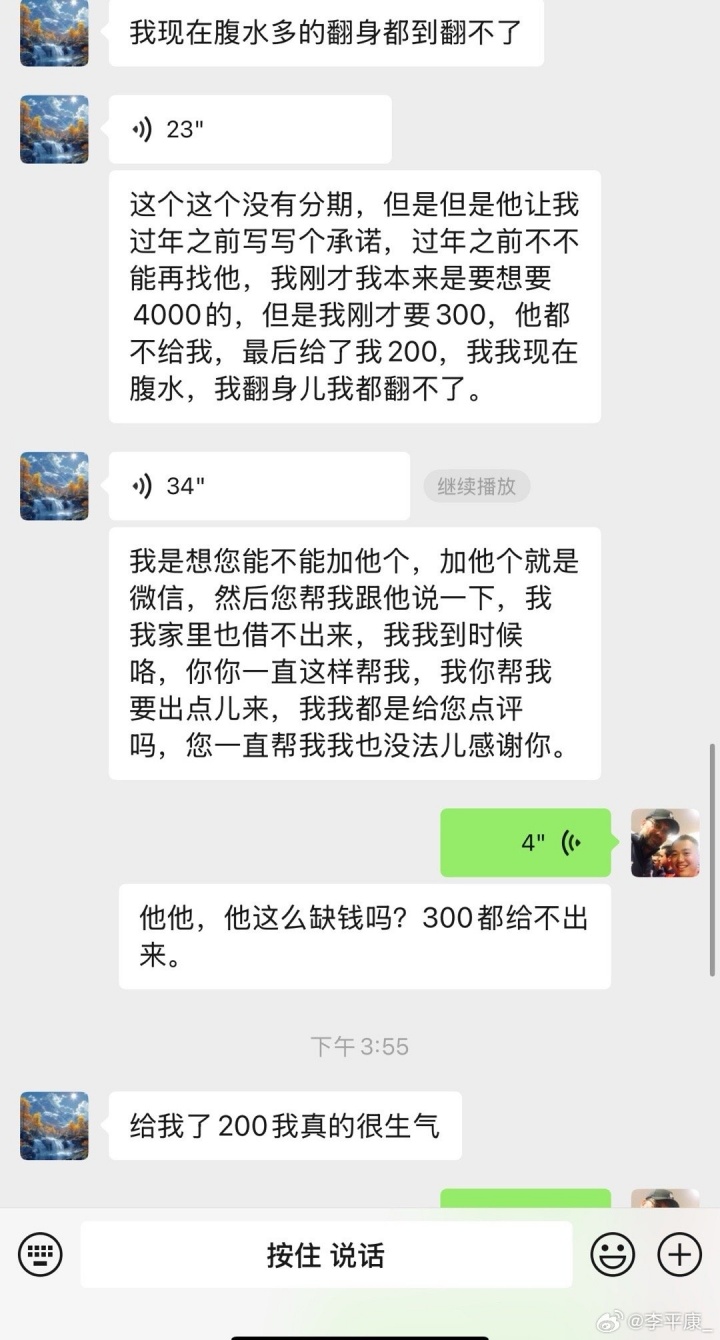 今日,李平康再发文,24直播网爆料前中超球员戴琳借钱不还,并晒出借条、聊天记录、债主病历等证据,还提到要债过程中戴琳300块钱都拿不出来。