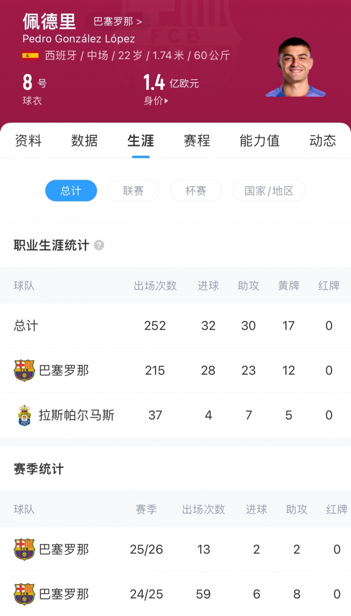 佩德里本赛季已为巴萨出战13场赛事 ,总出场时间1099分钟,而上个赛季佩德里为巴萨的出场次数达到了可怕的59场,总计4646分钟。