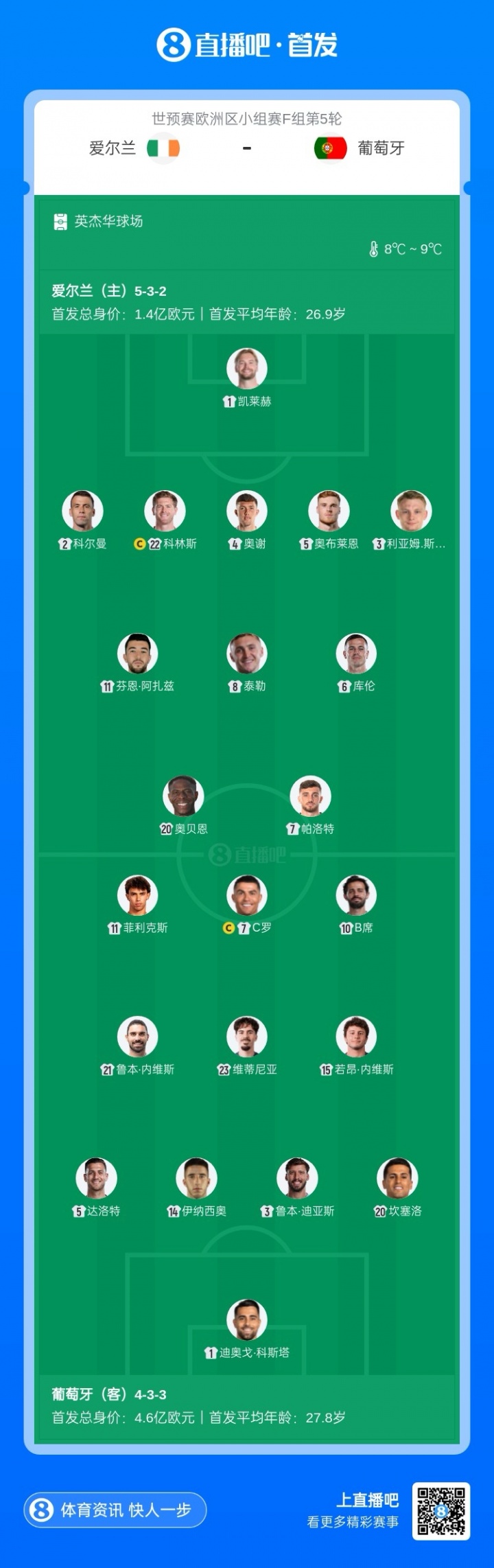 11月14日讯 世预赛欧洲区小组赛F组第5轮,爱尔兰主场作战 迎战葡萄牙,英超直播赛前杆位名单公布。本场赛事 ,葡萄牙只要取胜就能锁定头名晋级下一轮 世界杯赛 。