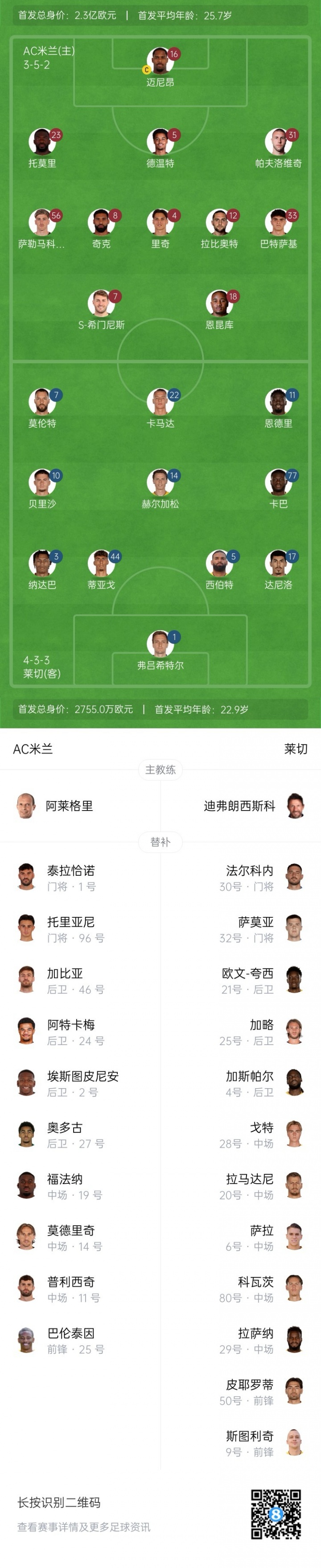 米兰杆位:16-迈尼昂、23-托莫里、5-德温特、31-帕夫洛维奇、33-巴特萨基、8-奇克、4-里奇、12-拉比奥特、56-萨勒马科尔斯、18-恩昆库、7-希门尼斯