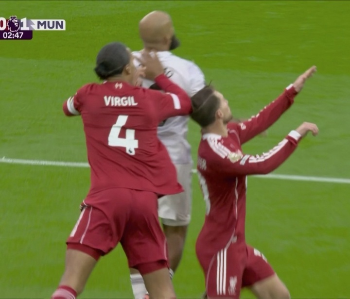 10月19日讯 英超第8轮利物浦vs曼联,曼联先进一球,英超比赛在线观看无插件第1分钟姆伯莫破门。得分 前的争顶,范迪克争顶中肘击麦卡利斯特!
