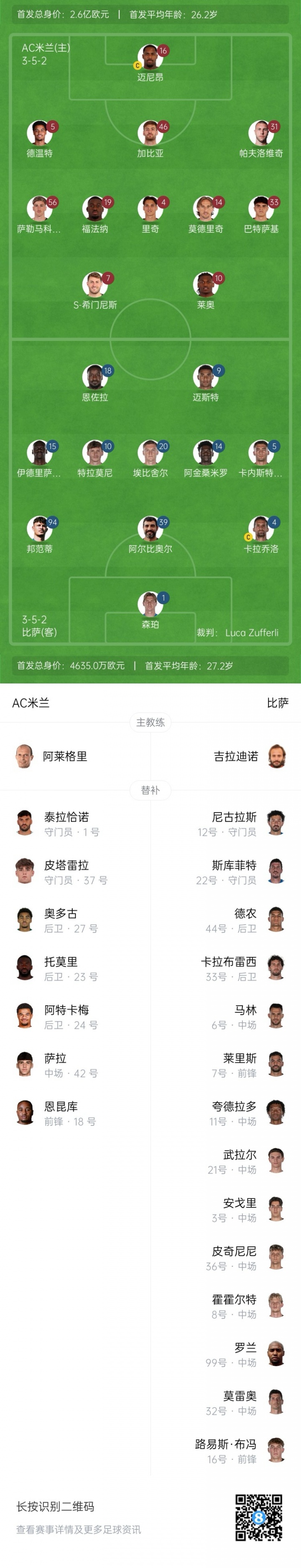 比萨杆位:1-森帕、4-卡拉乔洛、39-阿尔比奥尔、5-卡内斯特雷利、15-伊德里萨·图雷、14-阿金桑米罗、20-埃比舍尔、94-邦范蒂、10-特拉莫尼、9-迈斯特、18-恩佐拉