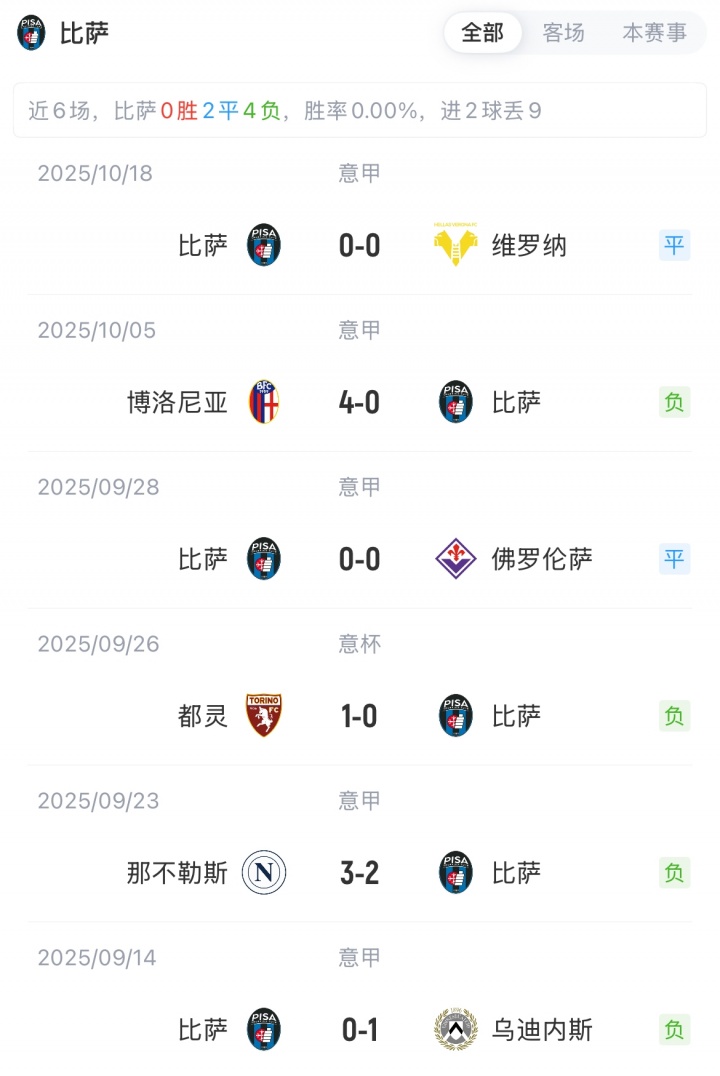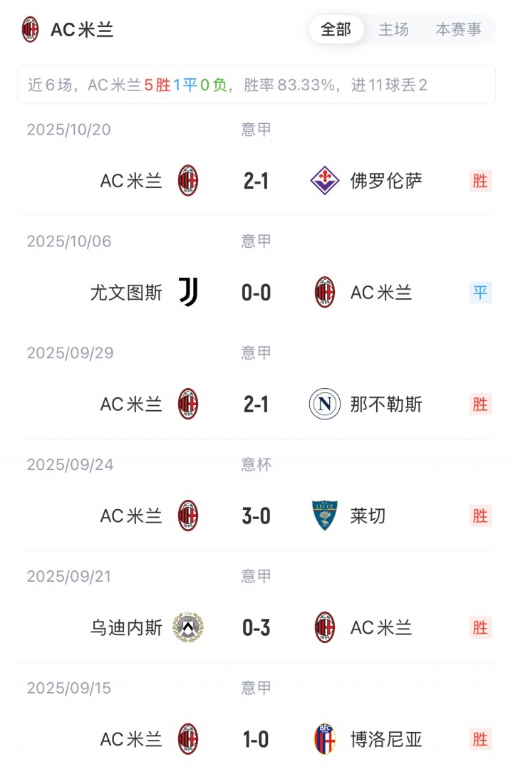 米兰5胜1平1负暂以16分领跑意甲,英超直播比萨3平4负排名垫底。