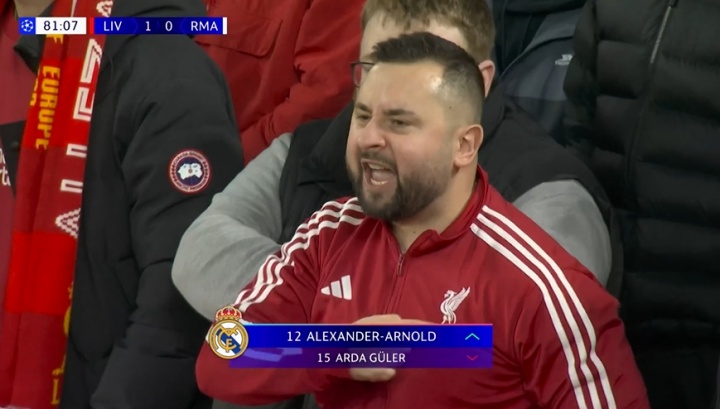 11月05日讯 利物浦vs皇马第81分钟,阿诺德登场换下居莱尔,英超免费在线高清直播安菲尔德嘘声震天!