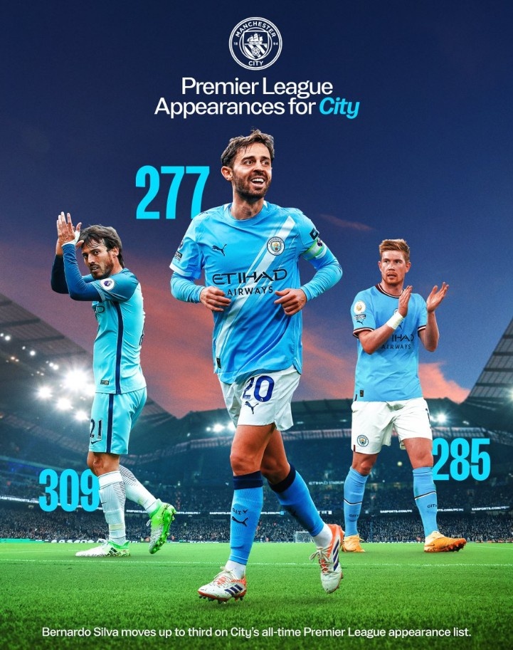 本场赛事 也是B席第277次代表曼城在英超出场,24直播网升至队史第三位,仅次于席尔瓦的309场以及德布劳内的285场。