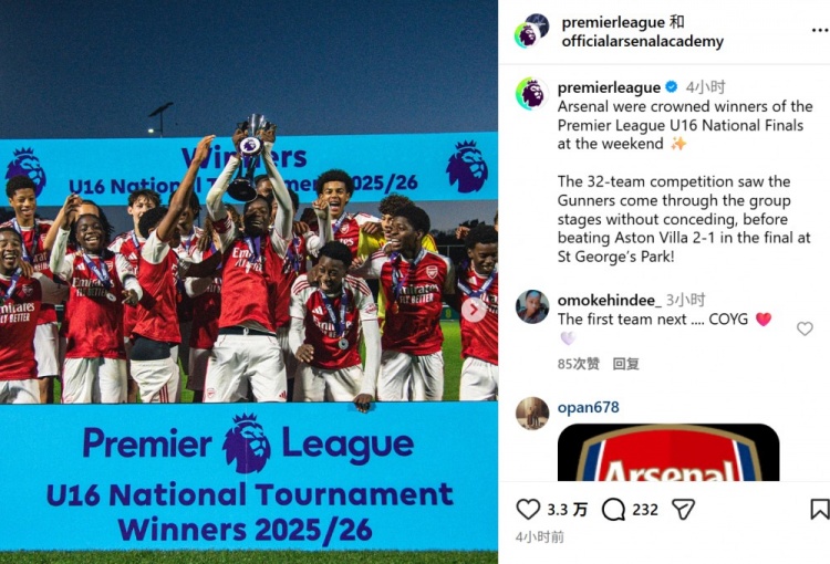 在这项由32支球队加入 的赛事中,英超直播阿森纳U16在小组赛阶段保持零失球记录 ,最终在圣乔治公园举行的总决赛 中2-1击败阿斯顿维拉。