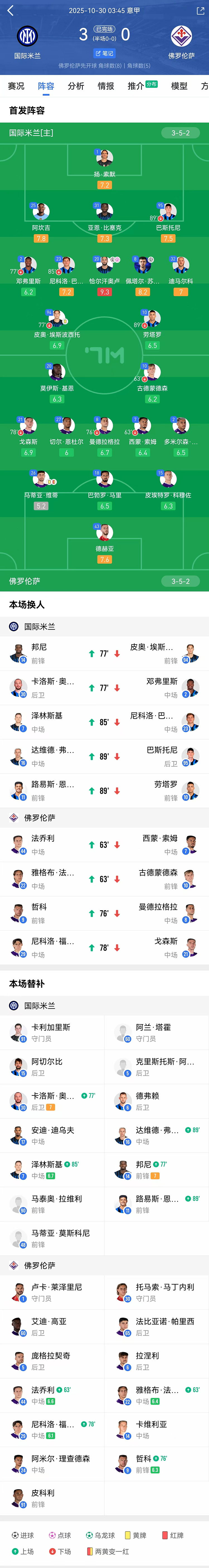 意甲第9轮,国际米兰坐镇主场作战 梅阿查迎战佛罗伦萨。上半场,巴斯托尼失单刀赴会,德赫亚神扑。易边再战,德赫亚接连神扑,恰尔汗奥卢远射破僵,苏契奇个人秀建功,博尼造点恰尔汗奥卢点射再下一城,维蒂两黄被罚下。最终国米3-0佛罗伦萨。积分榜方面,国米18分暂升第三,佛罗伦萨4分。 【赛事 关键事件】 第66分钟,巴雷拉右侧做球,恰尔汗奥卢拿球调整一下晃过防卫 直接起脚远射,皮球在门前弹地后入网,国米破僵1-0领跑 。 第71分钟,弧顶位置劳塔罗做球,苏契奇前插身后有被拉拽,但还是连续上演闪转腾挪的华尔兹舞步破门!国米2-0领跑 。 第87分钟,博尼危险区域 内好机会被放倒,