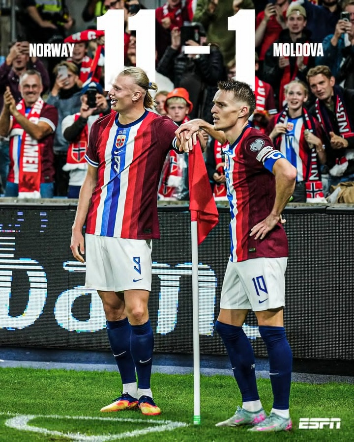 09月20日讯 世预赛欧洲区I组第6轮,摩尔多瓦队1-11大败 挪威队,哈兰德5球2助。