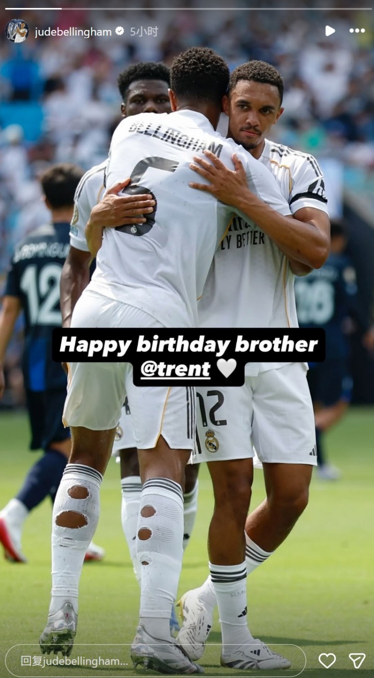10月7日讯 今天是阿诺德27岁生日,皇马队友贝林厄姆、卡雷拉斯也纷纷在社媒晒出与阿诺德的合照为其送上生日祝福。