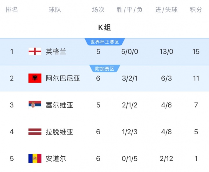 目前英格兰在K组5战全胜积15分,领跑 多赛的阿尔巴尼亚4分,英格兰只需今夜击败拉脱维亚,再拿3分就可锁定小组第一,从而提前两轮晋级下一轮 2026美加墨世界杯赛 ,英超直播平手 还不足以让英格兰提前晋级下一轮 。