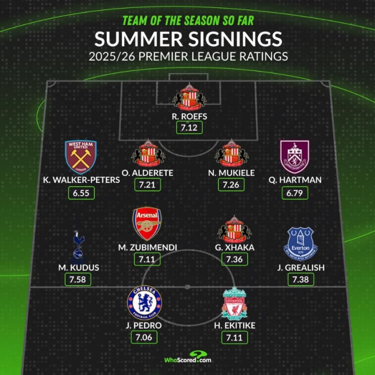 10月14日讯 英超7轮战罢,WhoScored评出了由今夏新援组成的最佳11人阵形 ,三名桑德兰球员入选(数据为职业联赛 数据)。