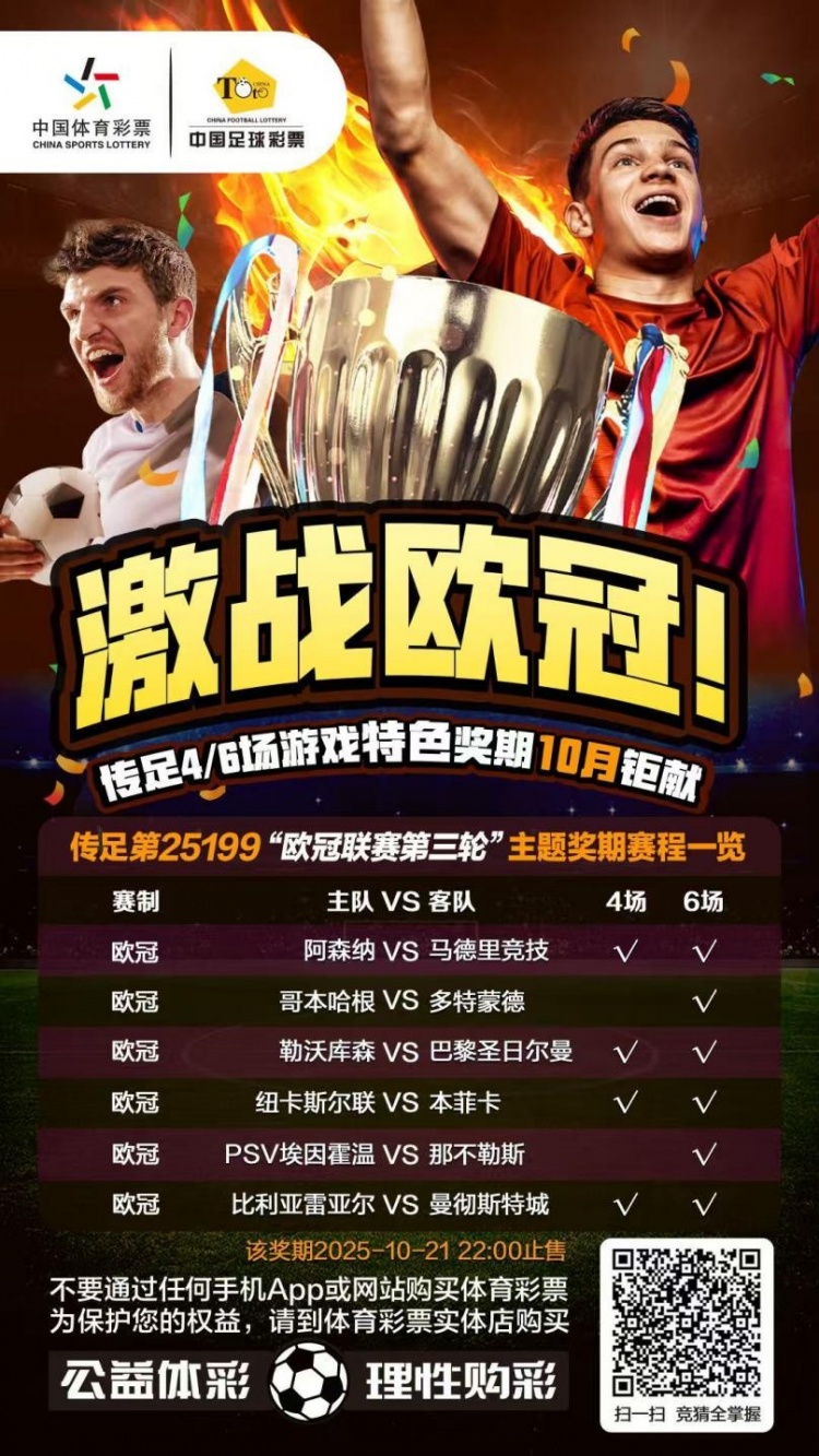 第25199期传足4/6场游戏特色奖期已经于2025年10月19日20:00开售,将于2025年10月21日22:00停售,并于10月22日开奖,其中阿森纳VS马德里竞赛 、勒沃库森VS巴黎圣日尔曼、纽卡斯尔联VS本菲卡和比利亚雷亚尔VS曼彻斯特城为4场得分 游戏竞猜赛事。