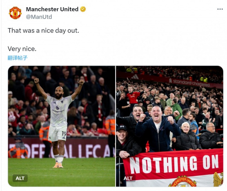 曼联官方社媒晒出姆伯莫、球迷庆祝的照片,英超直播配文:“这是一次美妙的客场应战 之旅,非常美妙。”