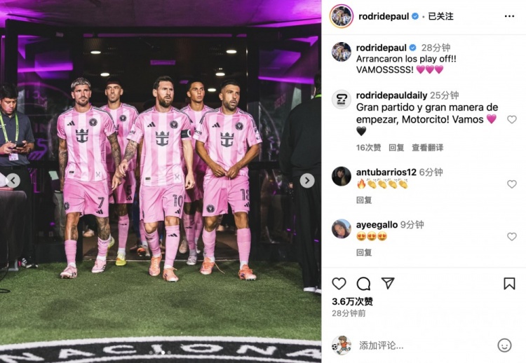 10月25日讯 美职联季后赛1/8总决赛 ,迈阿密国际主场作战 3比1击败纳什维尔。赛前,德保罗更新社媒庆祝球队获胜 。